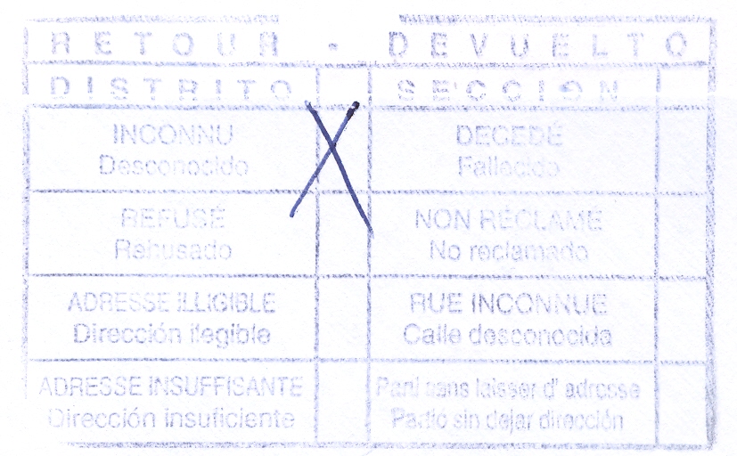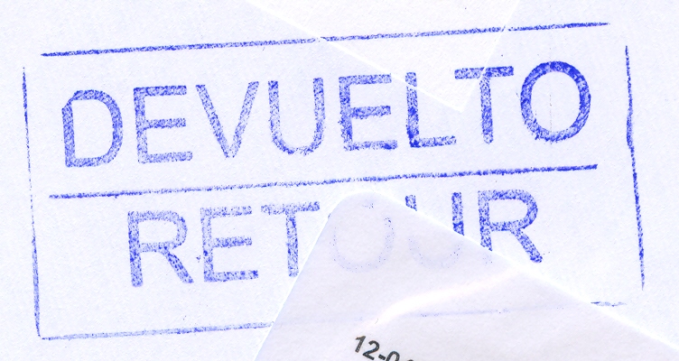 DEVUELTO / RETOUR (color negro) (utilizada el 01/04/2013 en el Distrito 3 de Madrid)