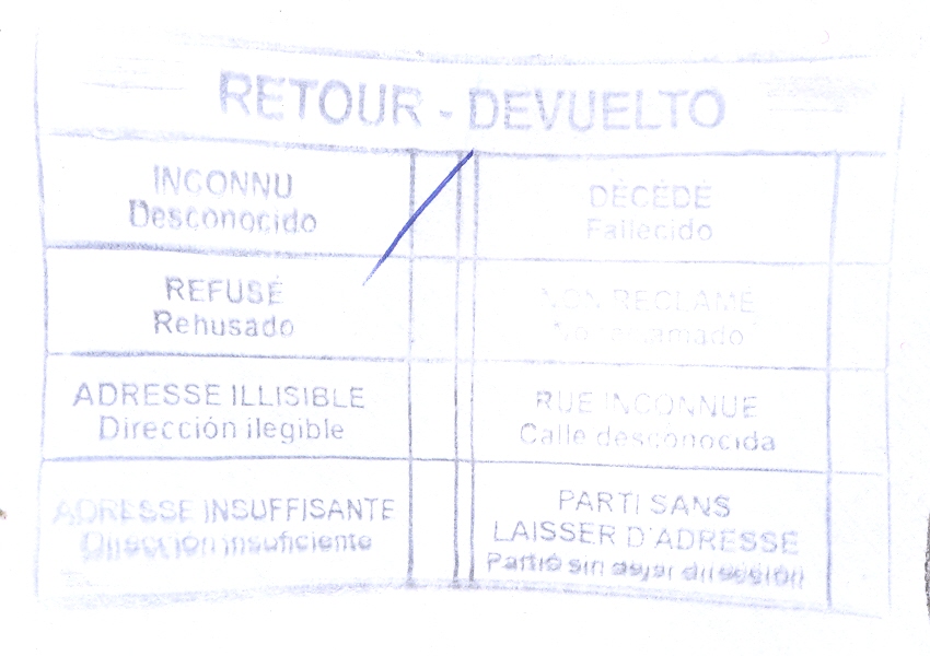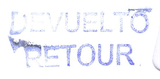 DEVUELTO / RETOUR (color azul) (utilizada el 07/11/2012 en el Dist. 21 de Madrid)