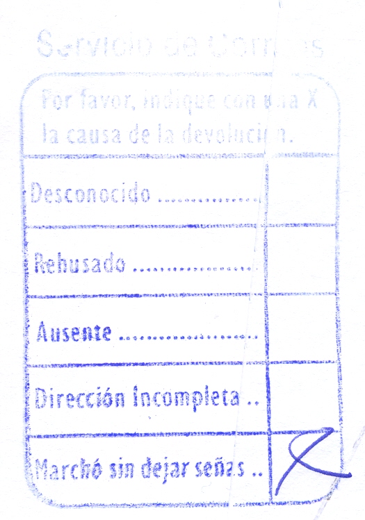 Servicio de Correos (color azul), para indicar la causa de la devolución (utilizada el 16/11/2012 en Alcoy, Alicante)