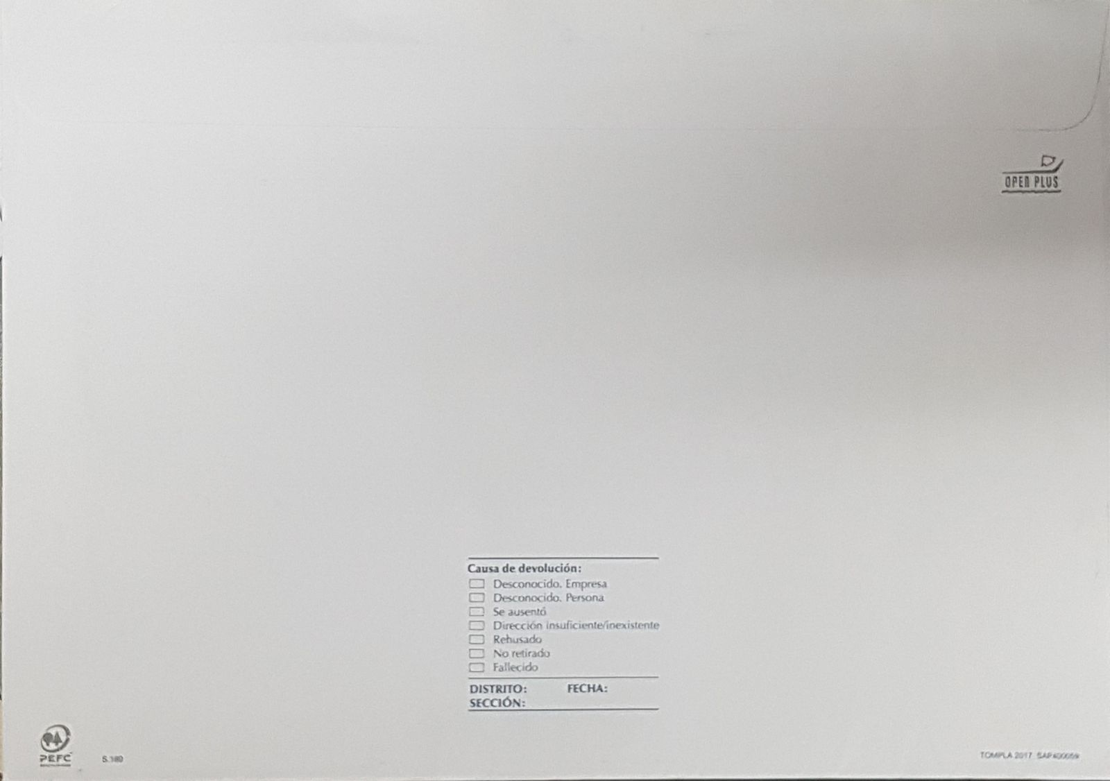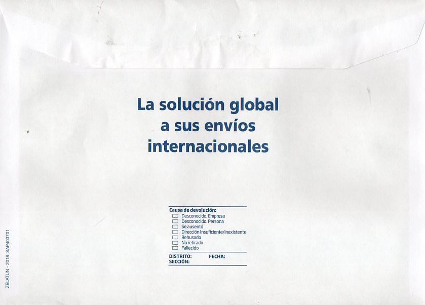 Descripción: Sobre con ventanilla grande a la derecha (para ver los datos del expedidor, código de barras, y datos destinatario) y ventanilla vertical estrecha a la izquierda (para visualizar otro código de barras, igual al anterior).