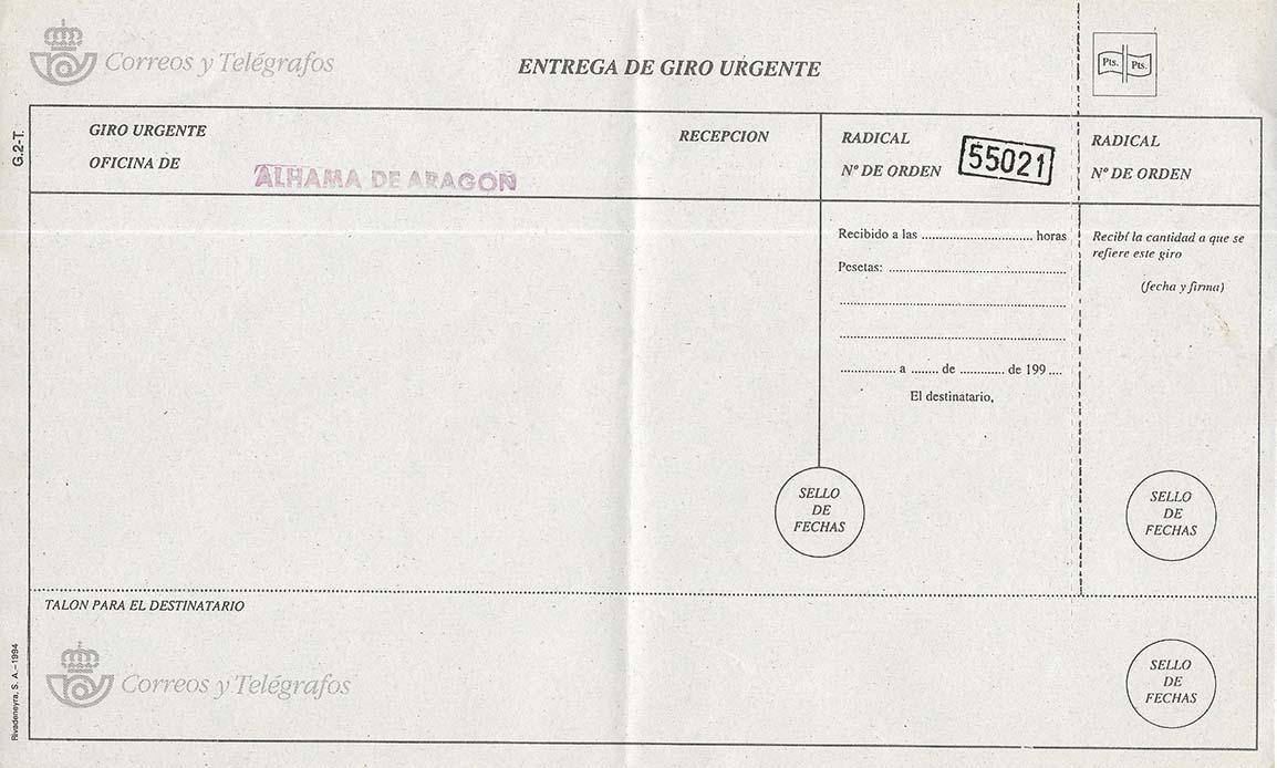 Me envían ejemplares del impreso de Entrega de Giro Urgente (sin cumplimentar). Unos correspoden a la oficina de Alhama de Aragón y el resto en blanco (sin indicación de oficina). El primero de ellos lo incluiremos en la segunda edición del libro que junto a Luis hemos editado hace un par de meses, En la casilla de Radical / Nº de Orden del impreso de la oficina de Alhama puede verse una marca con el numeral 55021 dentro de un rectángulo.