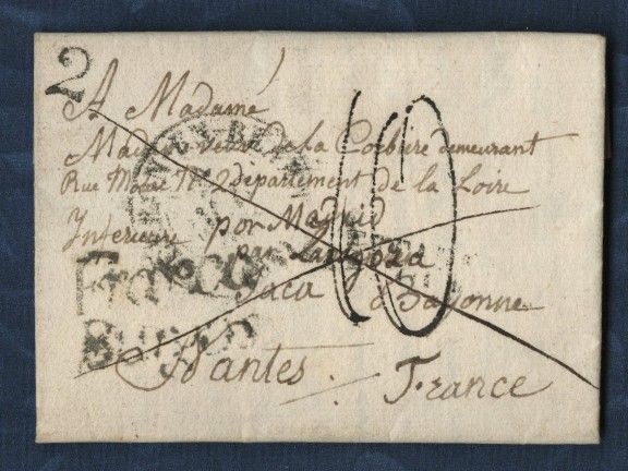 Tiene una marca en azul DE FRANCIA, la cual aparece en el Tizon en el capitulo dedicado a Barcelona. Quiere decir esto que la carta paso primero por correos en Barcelona y estos la estamparon asi? Tambien me parece curioso el porteo "5Rs.4ms.". Es una marca o son DOS juntas? Por la coincidencia del color rojo, parece una.