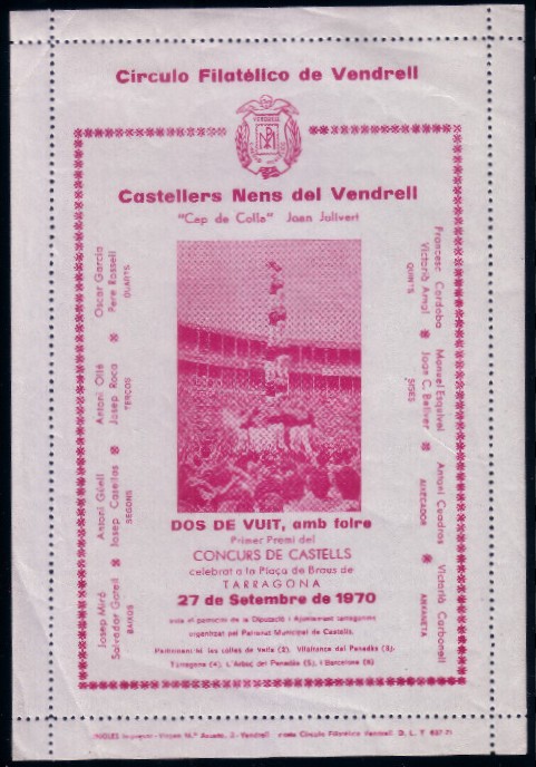 En Vendrell hay un sinfín de hojitas conmemorativas, el Círculo Filatélico fue muy prolífico y juntamente con el Sindicato de Iniciativas i el propio Ayuntamiento editaron muchas de ellas para promoción turística, como la que subo a continuación y de la cual hay en cinco versiones distintas de colores.