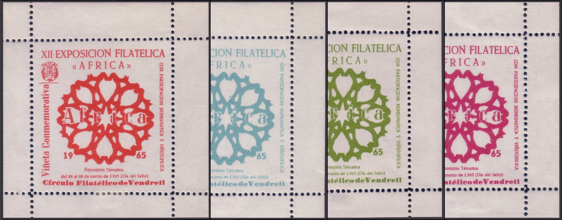 Una hojita en cuatro colores de Vendrell 1965 para la 12ª Exposición filatélica, con la temática "AFRICA",,, conozco las tres primeras sin dentar.