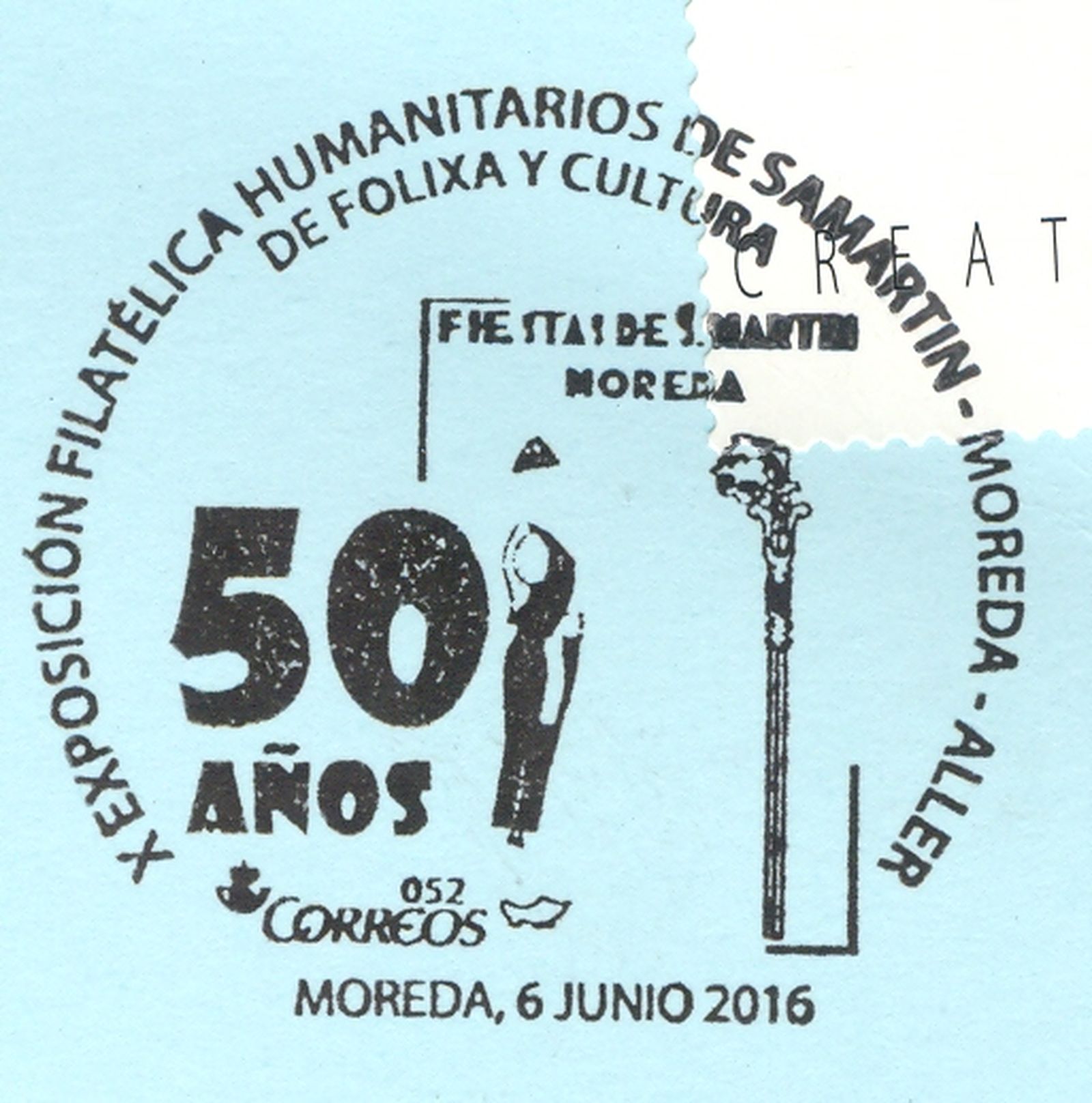 La décima de ellas del año 2016 (10/2016) hace referencia al matasellos, utilizado en Moreda, con motivo de la celebración de la "X Exposición Filatélica Humanitarios de San Martín - Moreda - Aller", festejando los "50 años de folixa y cultura de la Sociedad de los Humanitarios de San Martín"..