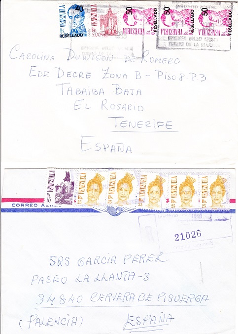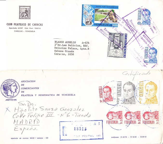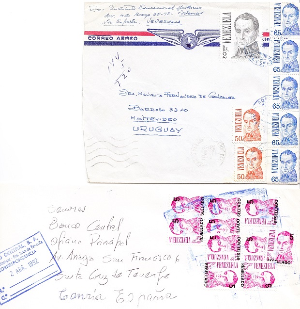 Aquí van algunos de esos muchos sobres recibidos desde el país "bolivariano". En algunos que iré poniendo más adelante, incluso se puede apreciar el comienzo de la "inflación" con los sellos "resellados".
