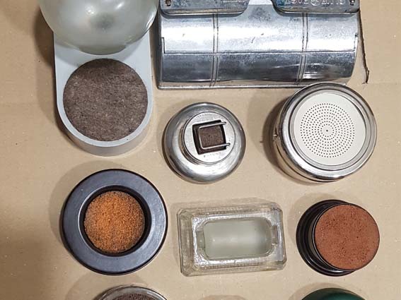 Algunos modelos de mojasellos que servían para que los remitentes de objetos a circular por correo no tuviesen que estar pasando la lengua por los sellos de Correos y fuese más sencilla y rápida la tarea de poner el franqueo en los envíos.