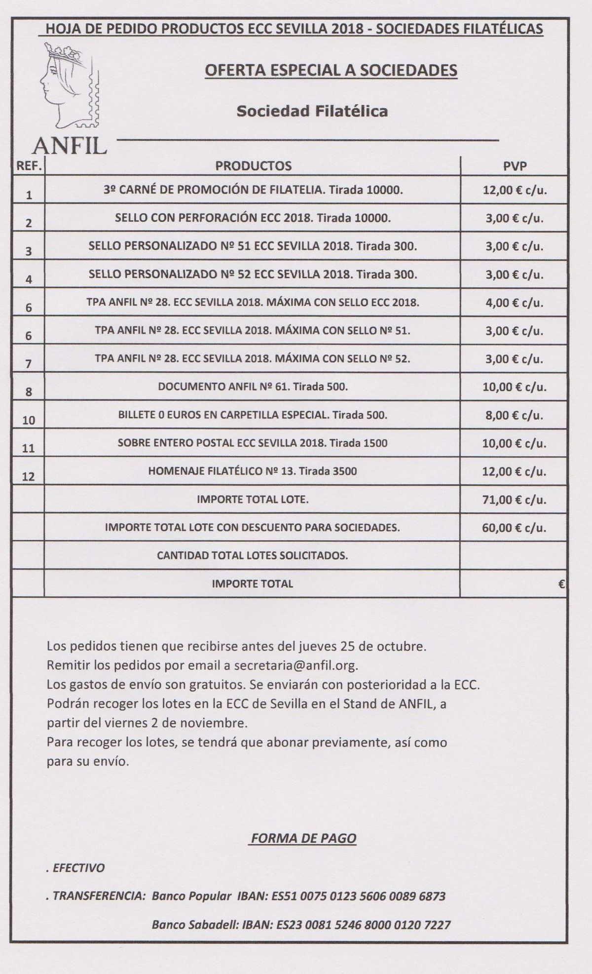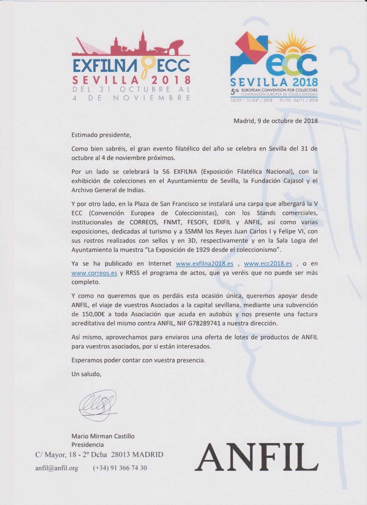 ANFIL, ha mandado a todas las Sociedades la carta que reproducimos a continuación, ofreciendo los lotes de productos que va a editar con motivo de la EXFILNA -ECC con un descuento del 15 % a quienes lo soliciten antes del 25 de octubre y una subvención para el viaje que cada Sociedad pueda hacer a Sevilla en autobús.