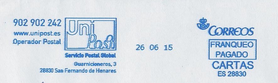 primero logo Unipost , después fecha y finalmente emblema de Correos.