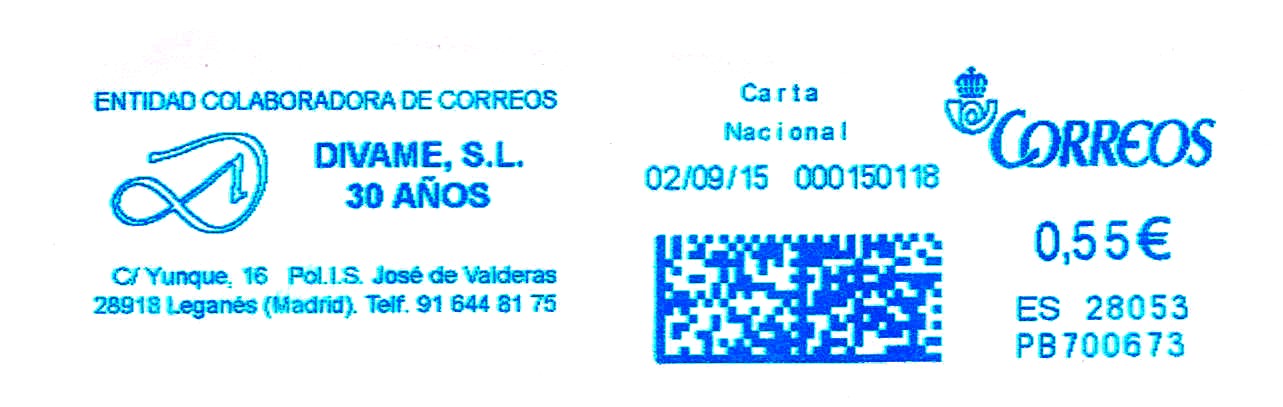 Por lo que respecta al hilo actual, aprovecho la reordenación que ha realizado de estos tipos de franqueos para mostrar un ejemplo actual de la empresa CIBELES MAILING que es igual al modelo 5C de la mismas, aunque con un tipo de tinta que difiere bastante del violeta empleado al principio del uso de la máquina.