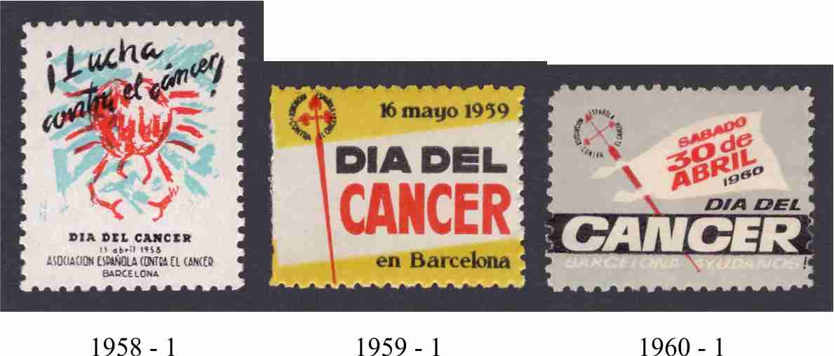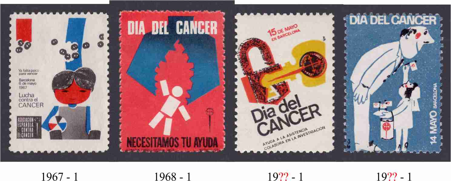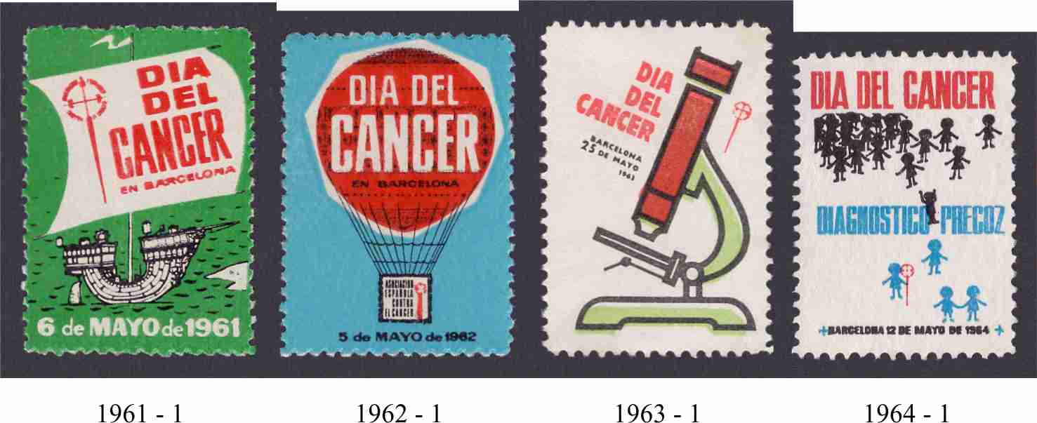 por lo que respecta al Día del Cancer en Barcelona, es un tema que tengo aparcado hace meses, pues me resulta difícil obtener información aparte de la que proporcionan la propias viñetas. Desconozco el formato de los pliegos y los autores de los carteles todavía.