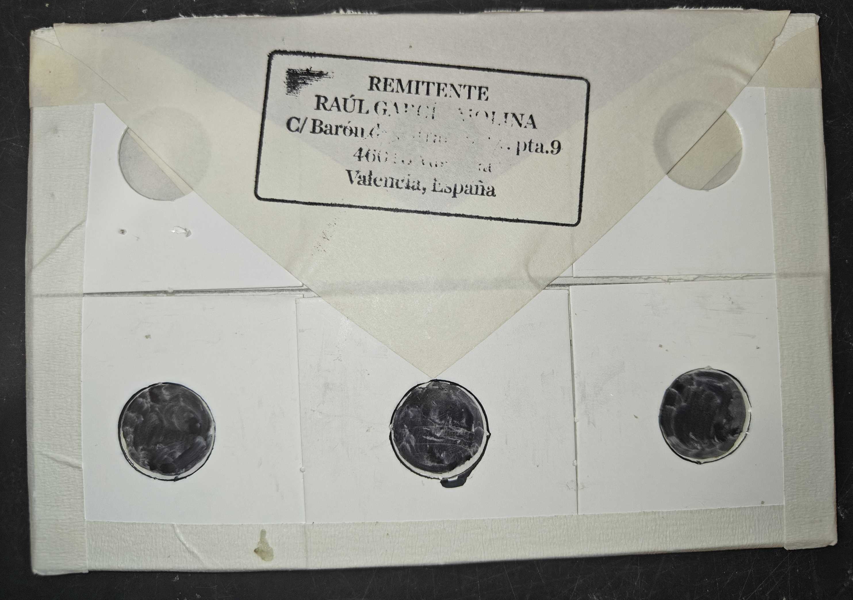 Igual no lo veís muy bien, pero parece un "trocito" de album numismático, es casi un paquete porque tiene bastante grosor aunque no se aprecie, con algunas monedas en sus cajetines, y que ha sido blindado en sus bordes con cinta. Lo franquea con un A2, supongo que ya iba preparado por si le decían que esto no es un envío normalizado y además debe pesar más de los 20 gramos...