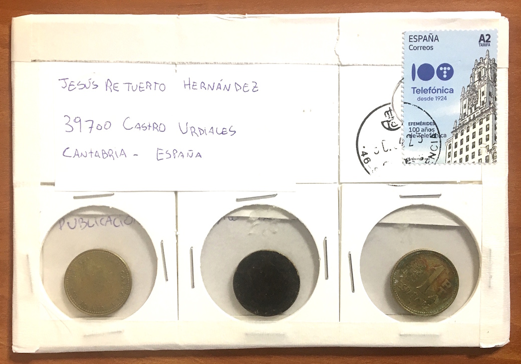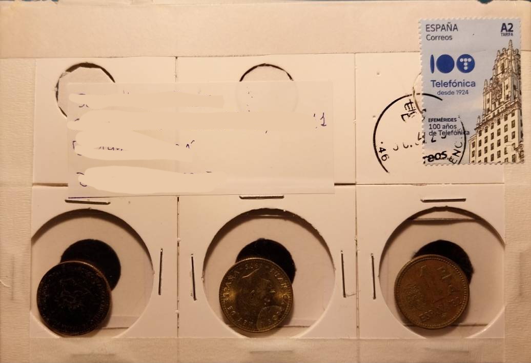 Por un lado, me alegro de que las monedas enviadas sean de 1 peseta, ya que, de no ser así, me habría generado el dilema de si sacarlas del cartón para incorporarlas a la colección. De esta forma, guardaré el bonito envío en su estado original, sin remordimientos jj.