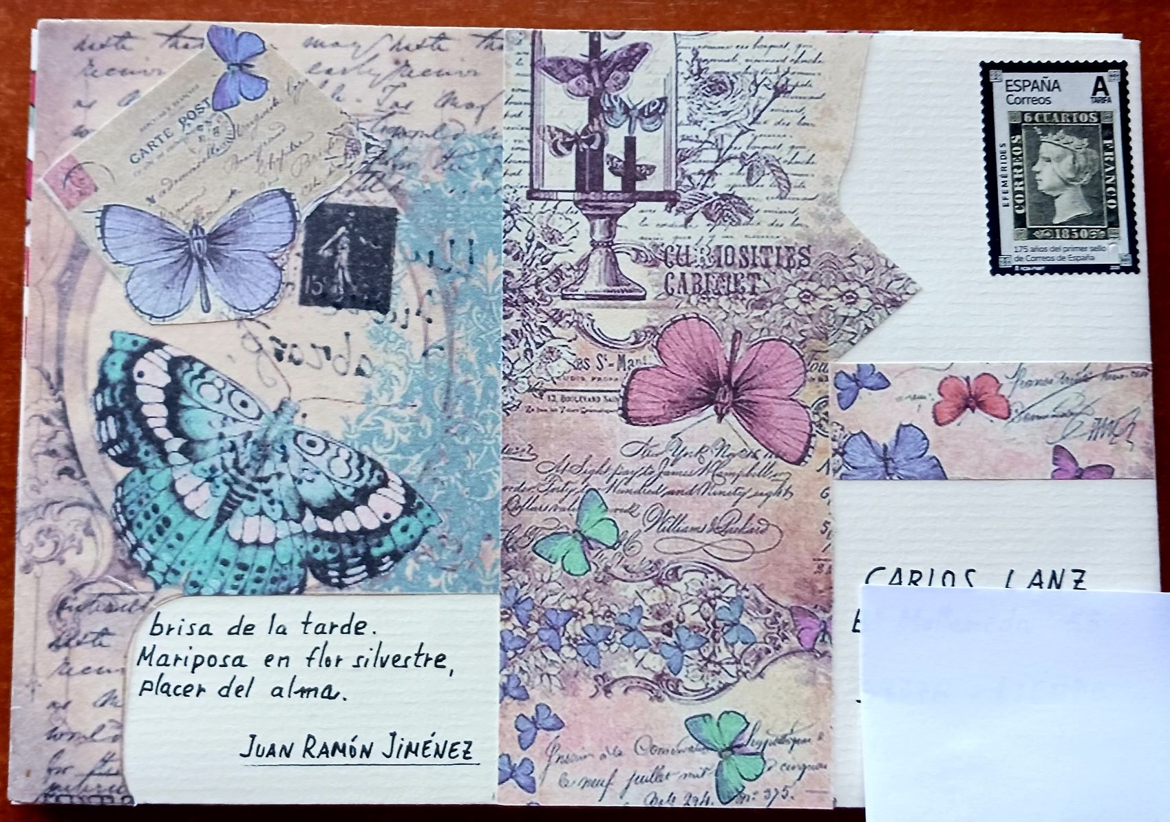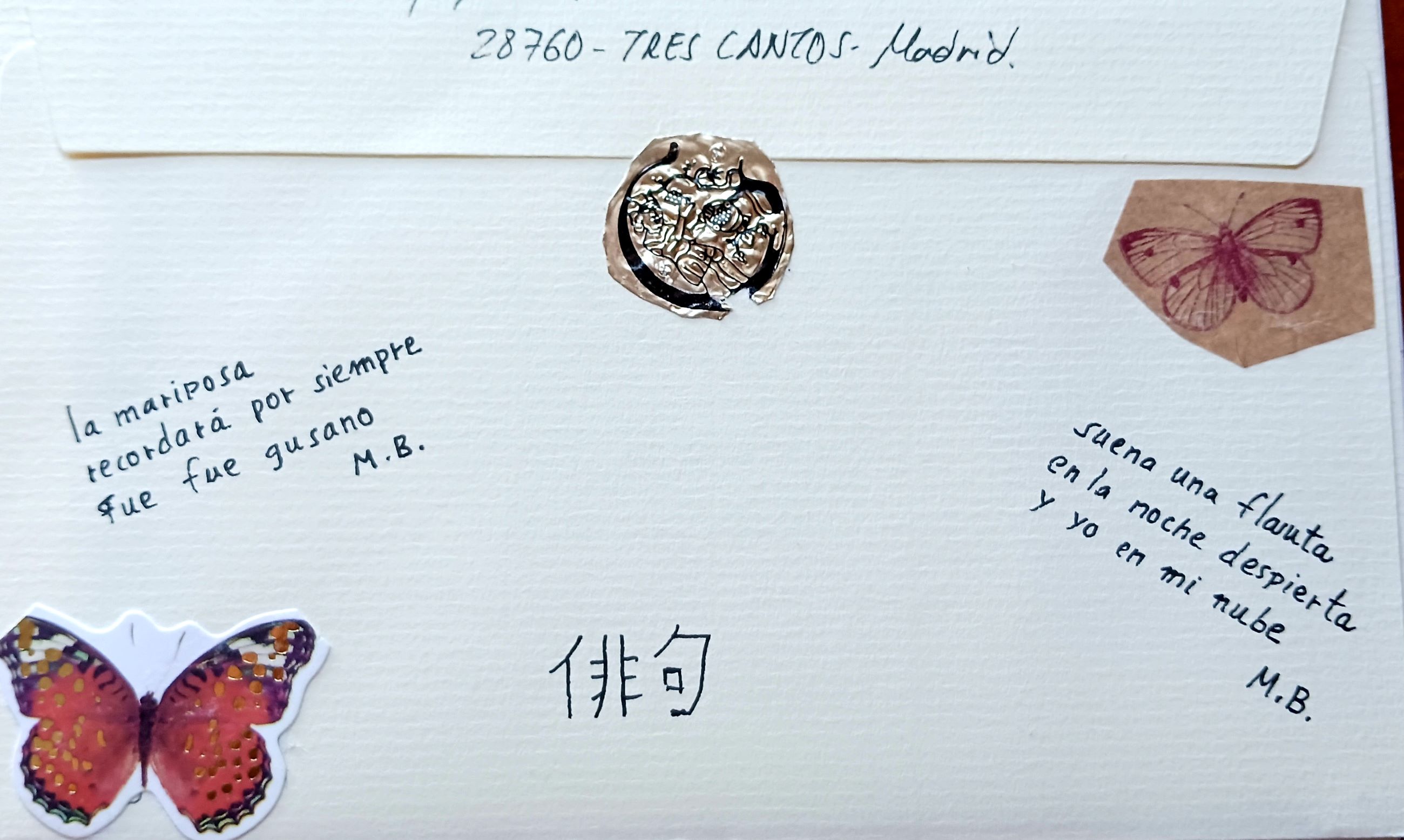 Aclararé que utilicé para la composición del anverso trocitos de papel especial de los que alguno de vosotros me había hecho llegar en forma de "chuches" (creo que fue Jesús; esto de la reutilización es maravilloso...). El haiku del anverso es de Juan Ramón Jiménez. En el reverso van otros haikus, de Mario Benedetti y unas pegatinas de más mariposas que guardaba por ahí. El trocito metálico que imita a un lacre de las antiguas cartas es de nuevo un recorte de las cápsulas de botellas de vino, que guardo para esta función. Por último busqué como se escribía la palabra Haiku en japonés y ahí aparece. Creo que también la puse en el resto de las enviadas en esta serie.