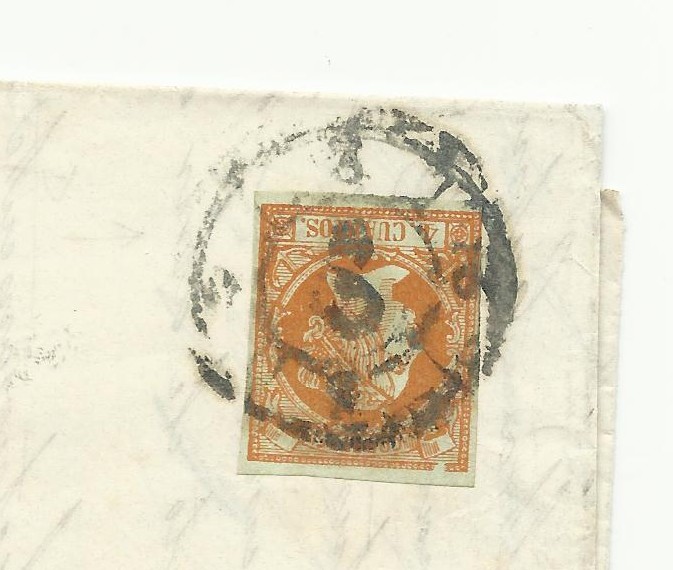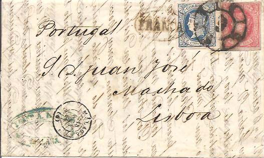 Aqui subo la Rueda de Carreta malagueña, ya vista anteriormente, pero cancelando el franqueo sencillo de la correspondencia dirigida a Portugal,donde a su llegada en Lisboa estampan la marca ovalada FRANCA que vuelve a pisar al valor de 2 cuartos. Saludos.
