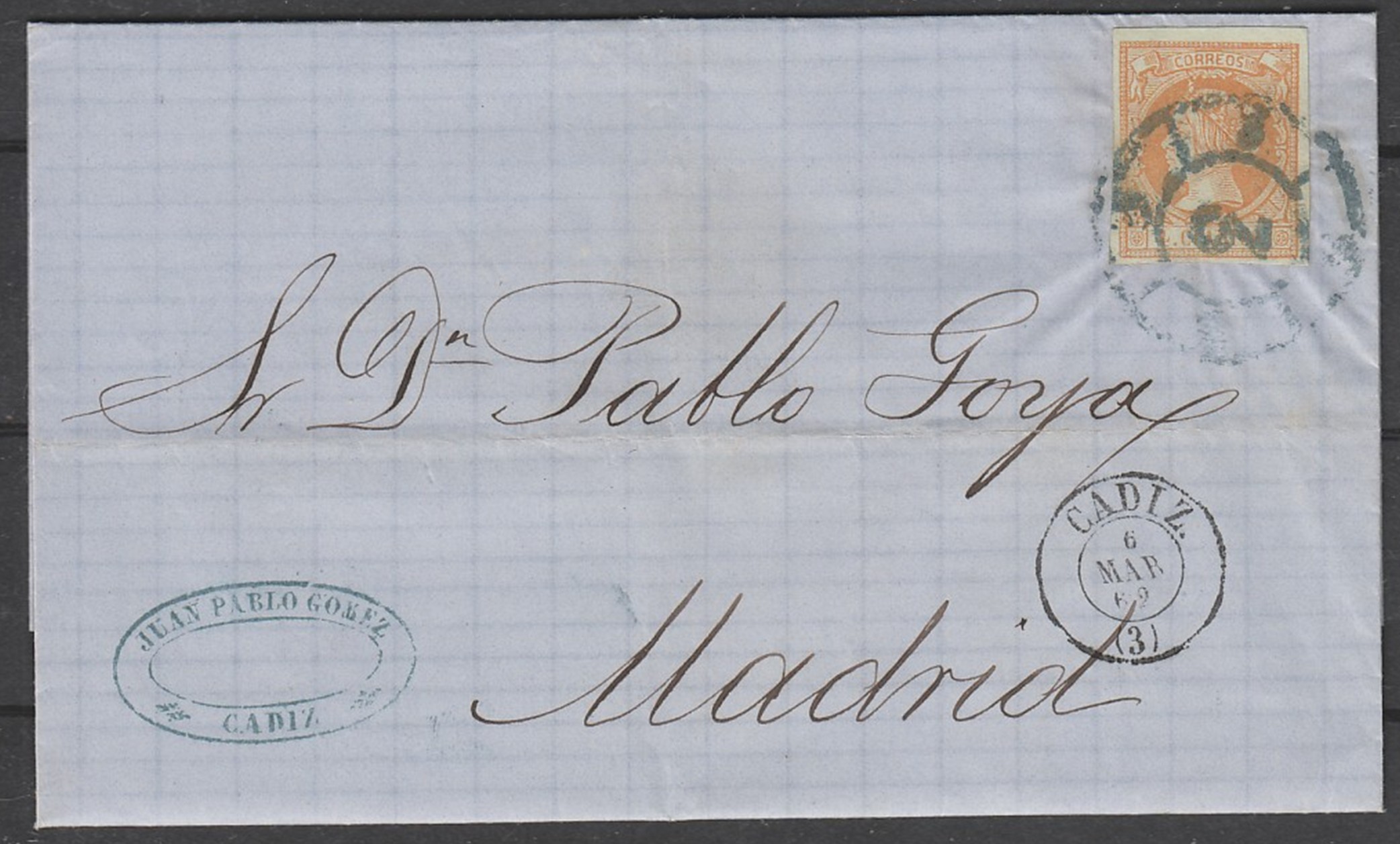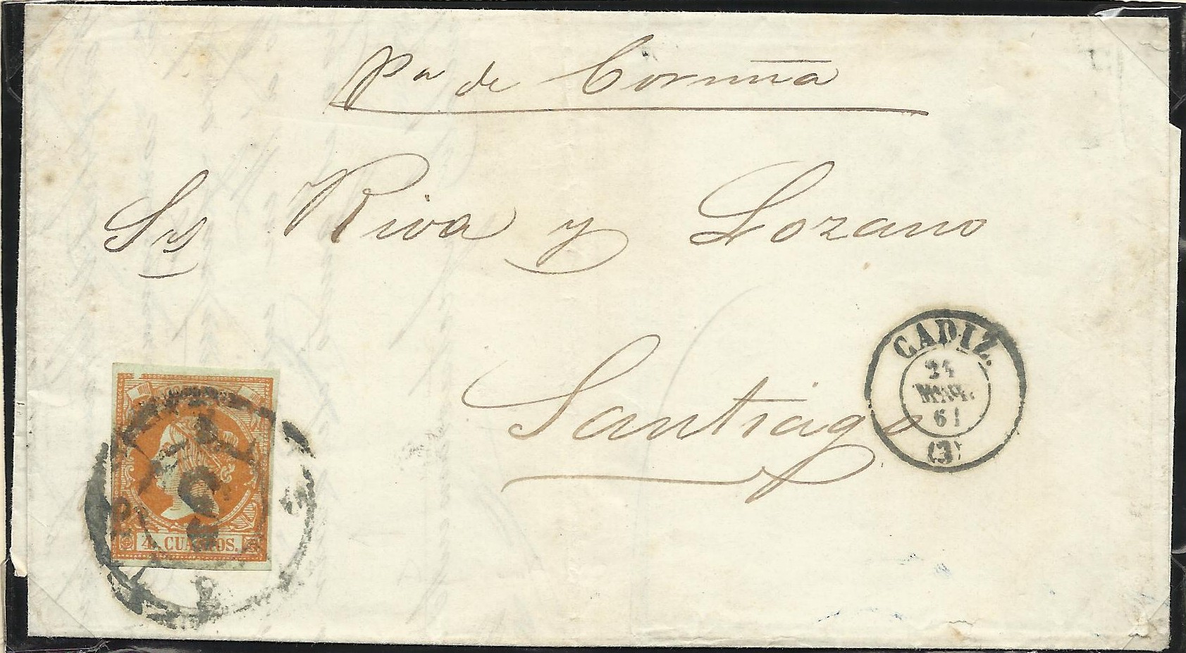 Hoy me gustaría mostrar el matasellos pero en color azul y de Cádiz. Es curioso que las 2 veces que se estampó, no se si más, coincidiese en el mes... marzo, tanto en 1861 como en 1862.