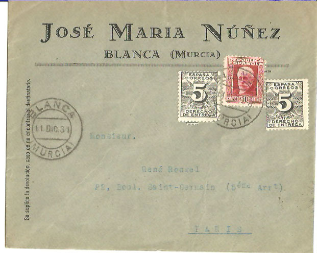 Cosas muy bonitas alguna me llaman la atención como el tercer matasellos aereo Bilbao, el matasellos de la sucursal avenidas de Palma, los dos sellos de derecho de entrega en la carta con el nítido matasellos de Blanca y el franqueo mecánico aleman, lástima de los sellos Marruecos aleman no obliterados, en general buenas compras no hablo nada del correo militar porque no me quiero meter en otra.