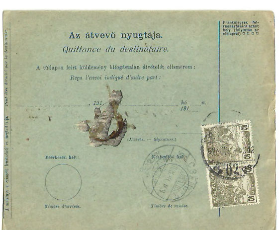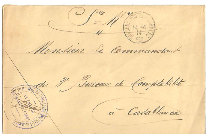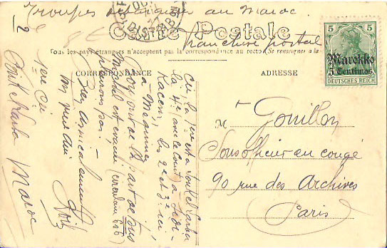 Las postales de Marruecos francés fueron primero preparadas con dos sellos del correo alemán, pero luego franqueadas con franquicia militar.