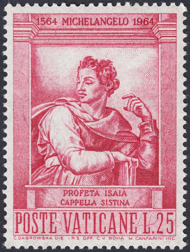 Serie integrada por cinco sellos y, como las mostradas de San Marino, diseñada por un solo artista, en este caso la polaca Casimira Dabrowska (1890-1972), que compenetra cada una de las partes con el todo, y tallada por cinco grabadores italianos. En esta primera entrada exponemos el retrato de Miguel Ángel, un grabado acentuado y magistral de Alceo Quieti, así como los sellos dedicados a los profetas Isaías, una talla pulcra y cuidada de Mazzini Canfarini, y Jeremías, obra evanescente y exquisita de Vittorio Nicastro.