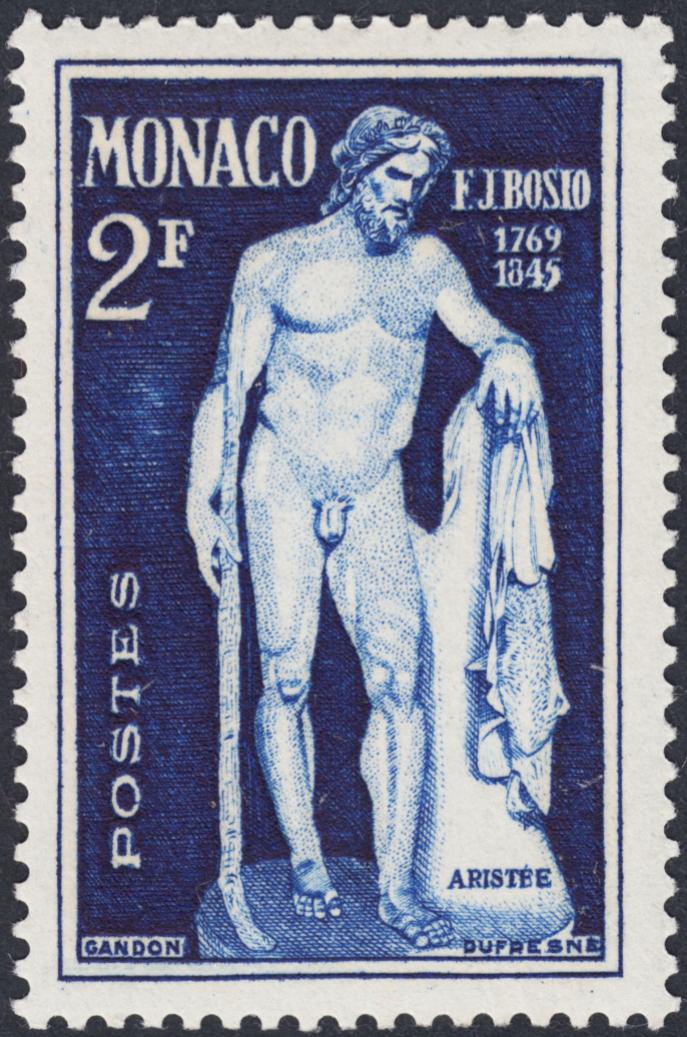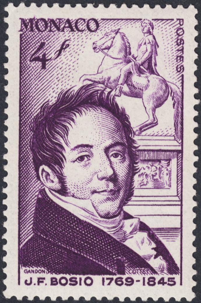 Esta serie de Mónaco, emitida en 1948 para honrar a su escultor más eminente, François Joseph Bosio (1768-1845), cumple esa conveniencia artística de un modo estricto. El encargado del diseño, y es de suponer que en el más amplio sentido, dado su magisterio, es Pierre Gandon, que no graba ninguno de los seis sellos que forman esta serie de nueve valores.