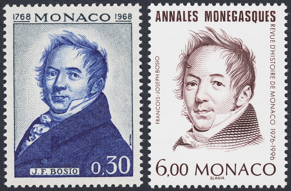 El sello mostrado del escultor Bosio y grabado por Slania, pertenece a una serie que Mónaco emitió en 1996 para conmemorar el XX Aniversario de la revista Anales monegascos. La serie está formada por ocho grandes personalidades relacionadas de algún modo con el Principado, y todos los sellos son obra de Slania, que entonces entraba en la última fase de su carrera artística incomparable.