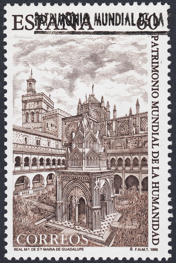 Al año siguiente, en 1967, se imprimía su primer sello: el del Castillo de Balsareny, que mostramos encima de estas líneas. Sería el primero de una carrera larga y concentrada que concluiría en 1995 con su último grabado postal impreso: el Claustro del Monasterio de Santa María de Guadalupe, expuesto como última imagen de esta entrada. Entre uno y otro, además de grabados para billetes, Antonino Sánchez talló sobre el acero algunos de los más bellos sellos de la filatelia española. Sirva como ejemplo de esta afirmación nada exagerada el sello que presentamos debajo de estos párrafos: el grabado de la fachada de la Casa del Cordón burgalesa, obra premiada a nivel internacional con toda justicia. ¡Excepcional concepción y no menos artística su ejecución! Una talla superior: pulida, exigente, intensa, proporcionada. ¡Perfecta! Una maravilla del arte del grabado en talla dulce.