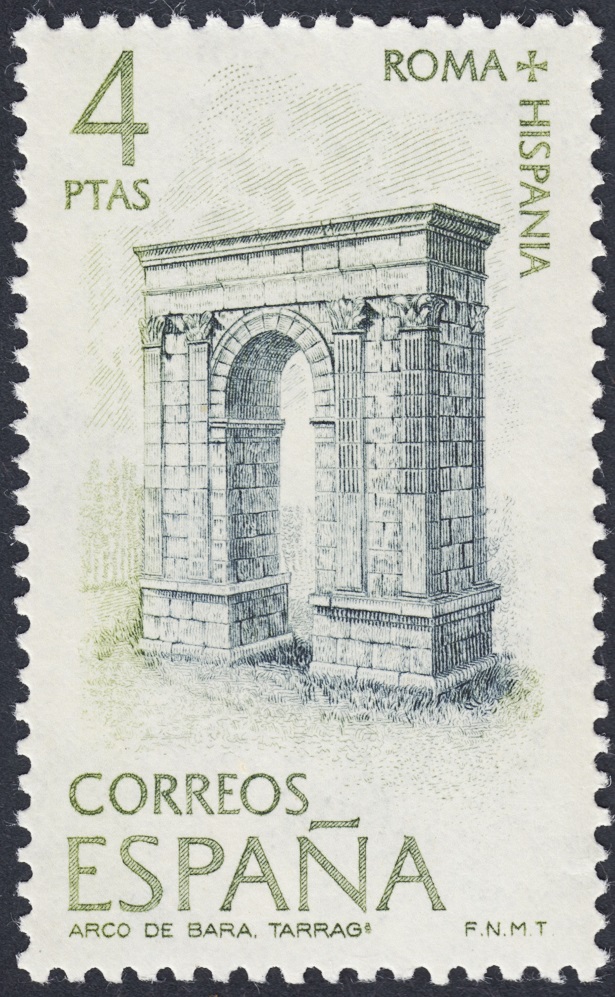 De la serie de la España romana emitida el año anterior, en 1974, dos grabados son suyos: el retrato de Marco Valerio Marcial (3p) y este sello que mostramos del Arco de Bará: un grabado terso y ligero que resume el estilo general de esta emisión soberbia.