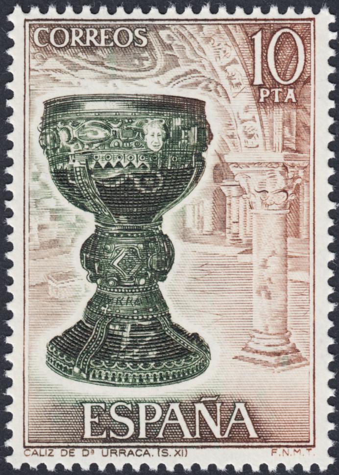Antonino Sánchez participó durante la década de los setenta en algunas de las series más brillantes de la filatelia española. De los ocho sellos que forman las dos hojitas de la Orfebrería de 1975, Antonino grabó cuatro: la Arracada y Brazalete púnico (50p), el Evangeliario del siglo XII (8p), el Cáliz de Doña Urraca (10p) y la Custodia del siglo XVI (12p). Exponemos en las primeras imágenes adjuntas estos dos últimos sellos. ¡Qué custodia! Una obra de excepción: talla recargada y no obstante, límpida y natural. ¡Excelente!