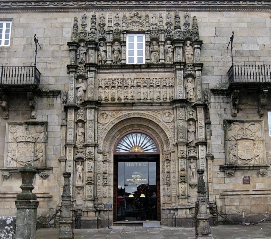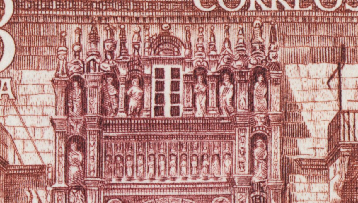 En primer lugar, una obra maestra de otra serie de excepción, la de Turismo y Monumentos: la fachada del Hostal de los Reyes Católicos (Santiago de Compostela), ¡hoy hotel!, sello impreso en 1976. Una talla frondosa y comprimida. ¡Qué grabado!