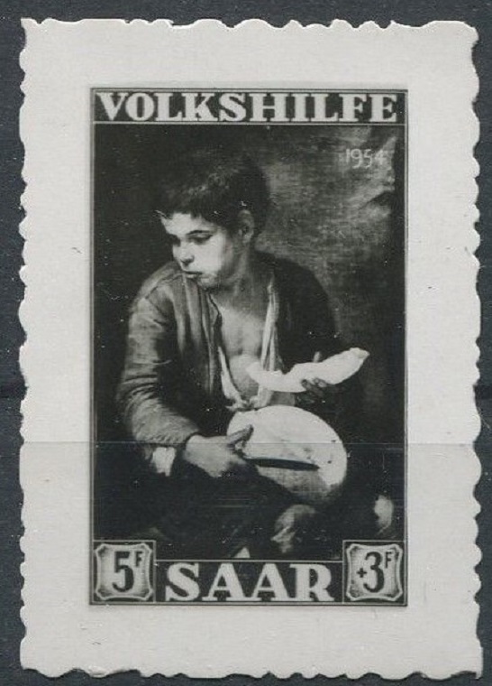 Este sello, que recrea a uno de los personajes de uno de los óleos más populares y acabados de Murillo, Niños comiendo uvas y melón, datado entre 1645 y 1650, se atribuye de ordinario a Pierre Munier (1889-1962). De este grabador francés, autor por lo demás de una obra muy notable y aglutinada en el tiempo, ya hemos puesto algún sello en páginas anteriores (*); enseguida haremos un perfil entusiasta de su arte y de su obra.