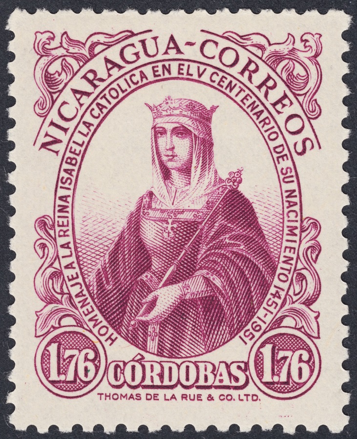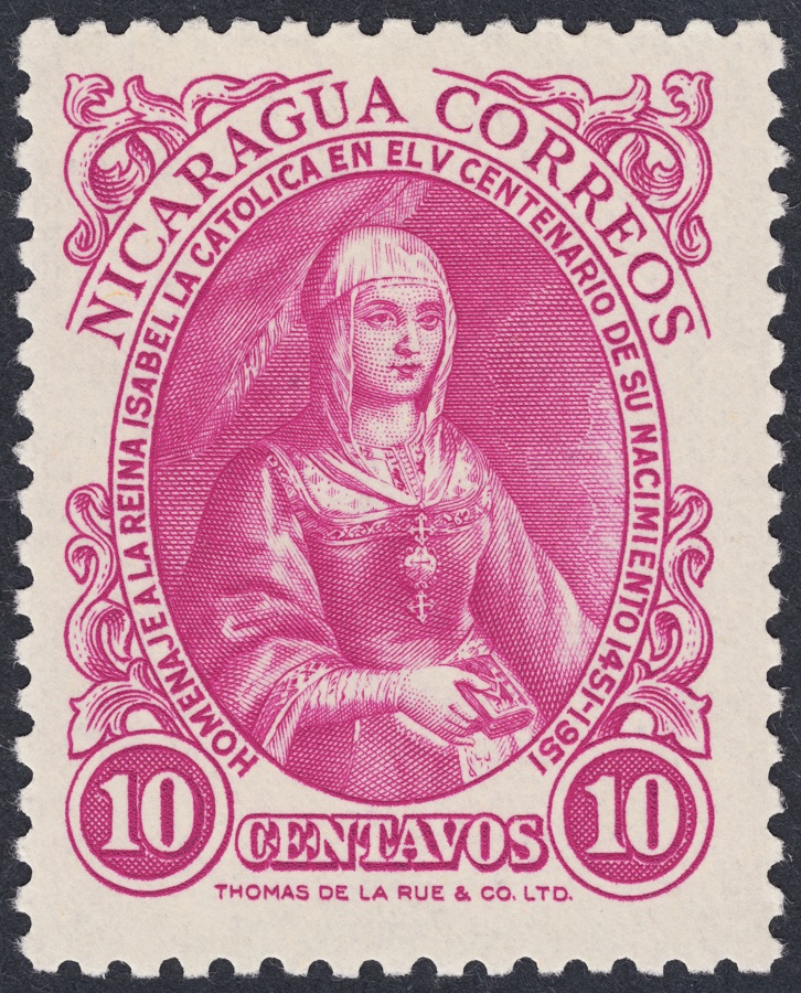 Continuamos en el espacio del grabado anglosajón, en este caso es la casa, inglesa también, Thomas de la Rue, la encargada de esta serie excelente que Nicaragua emitió en 1951, conmemorando el V Centenario del nacimiento de Isabel la Católica.