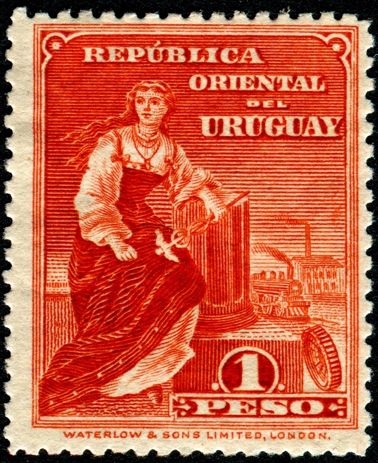 Añadimos ahora, de cara a la galería, y nunca mejor dicho, cuatro sellos sensacionales emitidos por Uruguay. Dos de las imágenes, los sellos de Hermes (Mercurio) y el que representa el Progreso Comercial, y que bien podríamos imaginar que es una Iris proletaria, bella y esbelta; estas dos imágenes, decía, proceden de la red. El de Mercurio es de 1895; el de Iris, de 1910, diseñado y grabado en Waterlow & Sons. El primero de ellos desconocemos en qué casa inglesa o norteamericana se grabó, pero es, como podéis ver, realmente excepcional: Hermes parece que se acaba de asomar por la pequeña claraboya que a duras penas deja el marco.