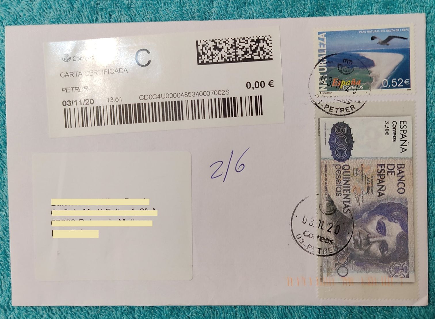 Ayer recibí este certificado, como era de una casa de filatelia, el franqueo correcto esta realizado con sellos, en el camino alguien se quedo con los que sellos equivalentes a 2 euros de franqueo, una pena.