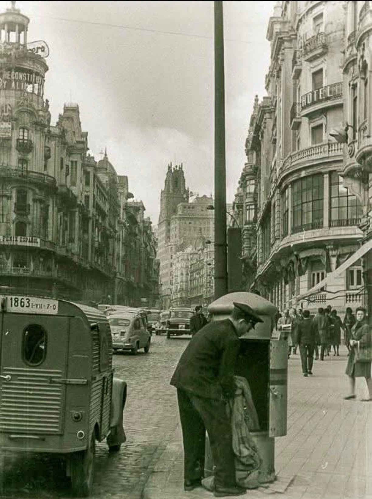 Preciosa imagen de un cartero recogiendo cartas en la Gran Vía de Madria a mediados de los 60.