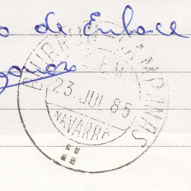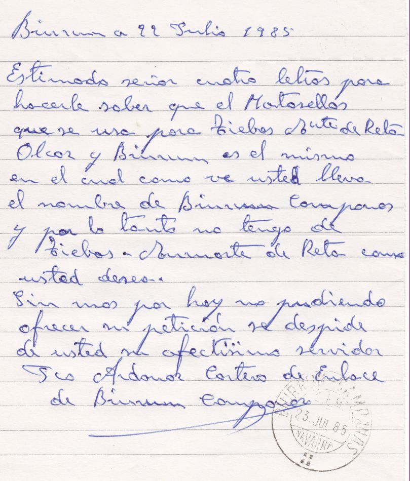 -"Biurrun, a 22 Julio 1985: Estimado señor cuatro letras para hacerle saber que el matasellos que se usa para Tiebas Mu(ruar)te de Reta, Olcoz y Biurrun, es el mimo en el cual como ve usted lleva el nombre de BIURRUN CAMPANAS y por lo tanto no tengo de TIEBAS MURUARTE DE RETA como usted desea.