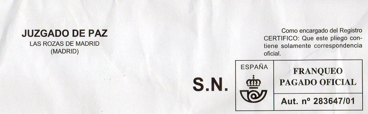Aut nº283677. Catalogado y registrado pero que tiene la particularidad de que el nº de autorización esta escrito a bolígrafo. FPO. Aut nº 283647/01. Juzgado de Paz de Las Rozas.