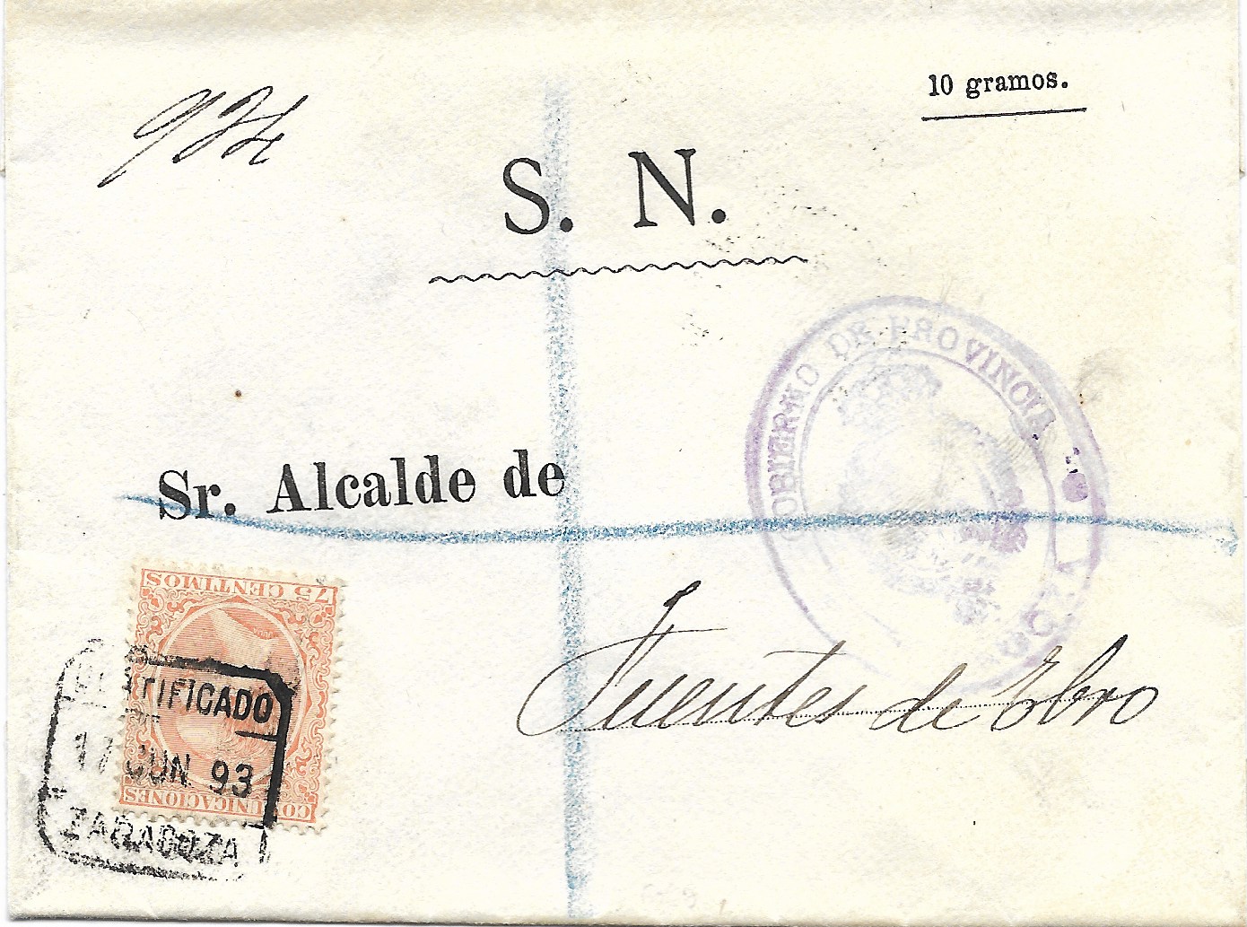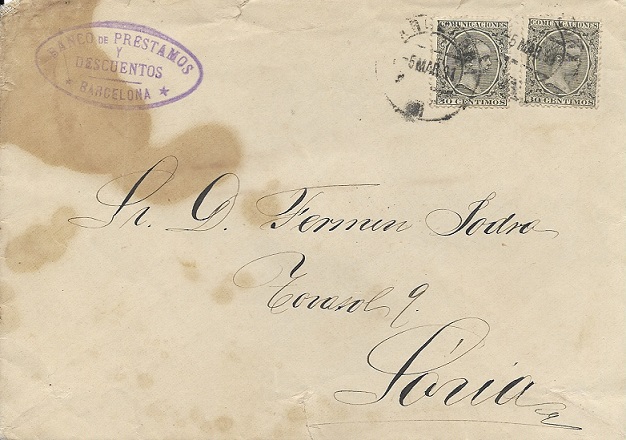 Se ha hablado de la escasez de los certificados anteriores a 1895(75 cts.).Aporto una rareza, desde mi punto de vista ,de esta tarifa al ser utilizado el sello de 75 cts.para el pago del derecho de certificado y marca de franquicia del Gobierno de la Provincia de Zaragoza en carta circulada a Fuentes de Ebro transportada en el AMB. VAL DE ZAFÁN al dorso con fecha del día 18.