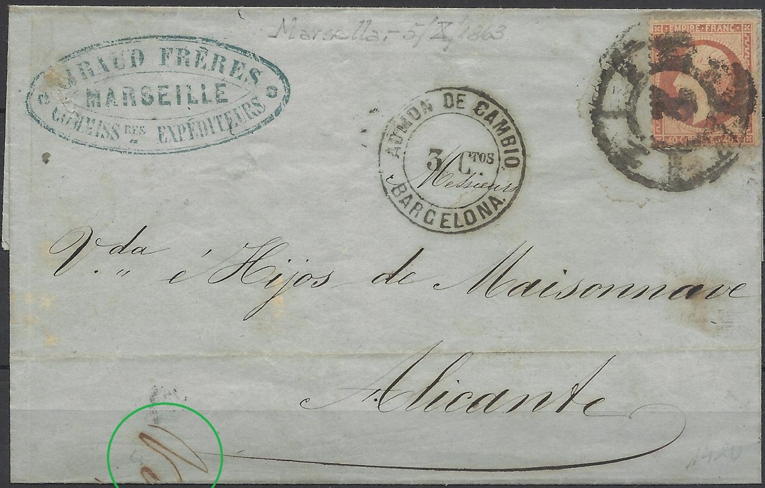 Para ello hoy muestro esta carta que creo que no hay ninguna de este tipo en el hilo y que adquirí en Torremolinos con motivo de la Exfilna, todo hay que decir que el soplo de donde estaba me lo dió "Fecabo". Circulada de Marsella a Alicante el 5/10/1863 y franqueada con un sello de 40 c. de Napoleón III (correcto para España) y cancelado con la rueda de Barcelona y marca de la Administración de cambio de esa ciudad con la tarifa interior de 3 cuartos.