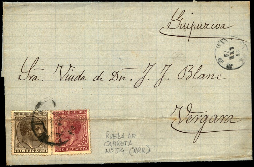 La primera (envuelta con texto) es con la rueda modificada de Bilbao y destino Viena en Austria y la otra (solo frontal) de San Sebastián con destino Remscheid en lo que era Prusia y hoy Alemania. Ambas van franqueadas con dos sellos de 12 cuartos para un total de 24 y que era la tarifa para un porteo simple correcto según los Convenios firmados con esos países.