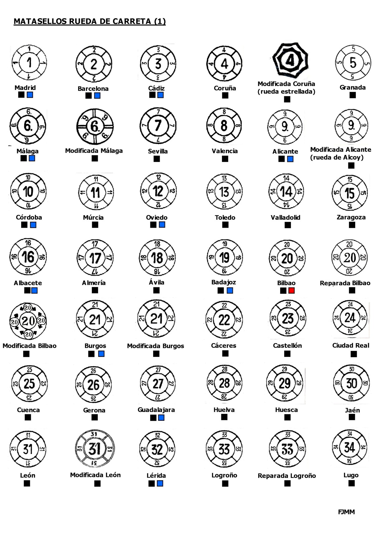 ) , vuelvo a hacerlo ya que las limpié y añadí los colores utilizados. Por cierto, he eliminado la rueda modificada tipo II de Vitoria, ya que en mi modesta opinión es una fantasía (la he visto siempre solo sobre sello y con varios numerales centrales diferentes, para mi demasiados matasellos para un espacio tan corto de tiempo de utilización).