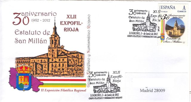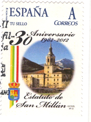 El Grupo Filatélico y Numismático Riojano ha emitido un sello personalizado (el número 12 de su colección), dedicado al 30 Aniversario del Estatuto de San Millán 1982-2012, con ocasión de la celebración de la XLII EXPOFIL-RIOJA, II Exposición Filatélica Regional, celebrada del 3 al 9 del presente mes de junio.