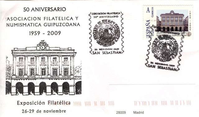 Se me había pasado dar cuenta del sello personalizado que realizó la Asociación Filatélica y Numismática Guipuzcoana con ocasión de la Exposición Filatélica que en conmemoración de 50 aniversario de la citada Asociación tuvo lugar del 26 al 29 de noviembre del año 2009.