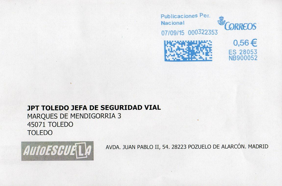 En principio, yo diría que es una de estas 150 franqueadoras si la numeración empieza por NB400 el número es el doscientos y pico, no lleva cartela publicitaria, la fecha del franqueo es posterior a mayo de este año (que es cuando se adjudica el concurso) y el número secuencial del franqueo es bajo. A ver si podemos acotar las números de matrícula de las mismas ya que es de suponer que serán seguidos.