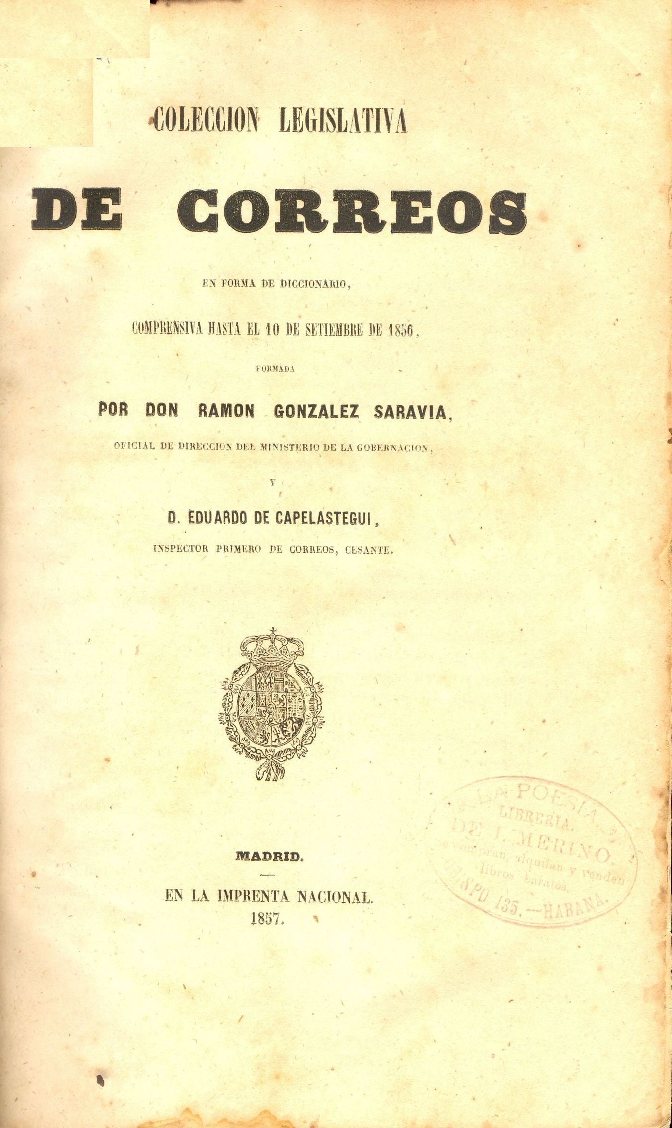 Título: COLECCIÓN LEGISLATIVA DE CORREOS EN FORMA DE DICCIONARIO, COMPRENSIVA HASTA EL 10 DE SETIEMBRE DE 1856