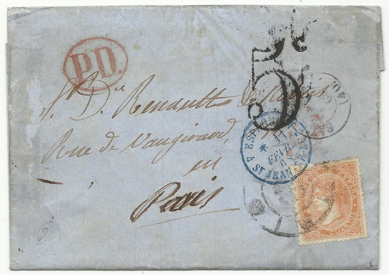 Carta con RC 38 de Pamplona sobre la emisión de 1864 (escasamente utilizada, ya que se utilizaba el prefilatélico "PAMPLONA" normalmente).