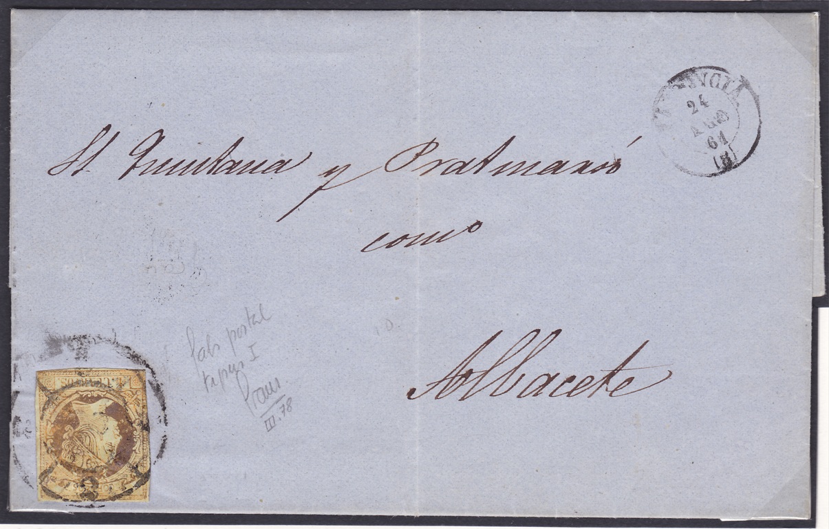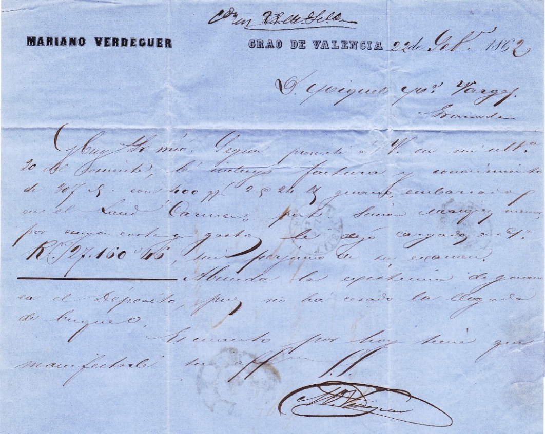 Presento esta carta de mi colección. Utilizando la Rueda de Carreta n.º 8 de Valencia a modo de franquicia, en la carta vemos en su parte superior Correos y el destinatario es el administrador cesante de la provincia de Granada. Creo que esta carta debería haber ido franqueada ya que su remitente es un particular y su contenido es una carta comercial pero por algún motivo se la aceptaron y circulo sin portes de ningún tipo y sin problemas.
