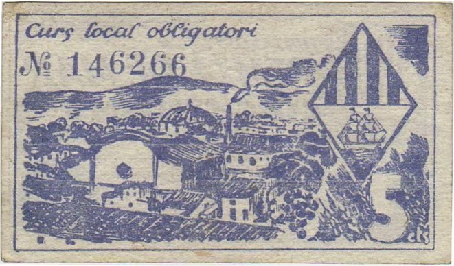 Yo, lo pondria con los billetes locales de la guerra civil de Premià de Mar (Maresme). No parece una viñeta. Aunque Ramon Turró, no lo recoge en la primera edición de su catálogo, que es el que tengo. Pero el escudo es el de Premià de Mar y este pueblo emitió billetes de 5 ctms en el 1937.