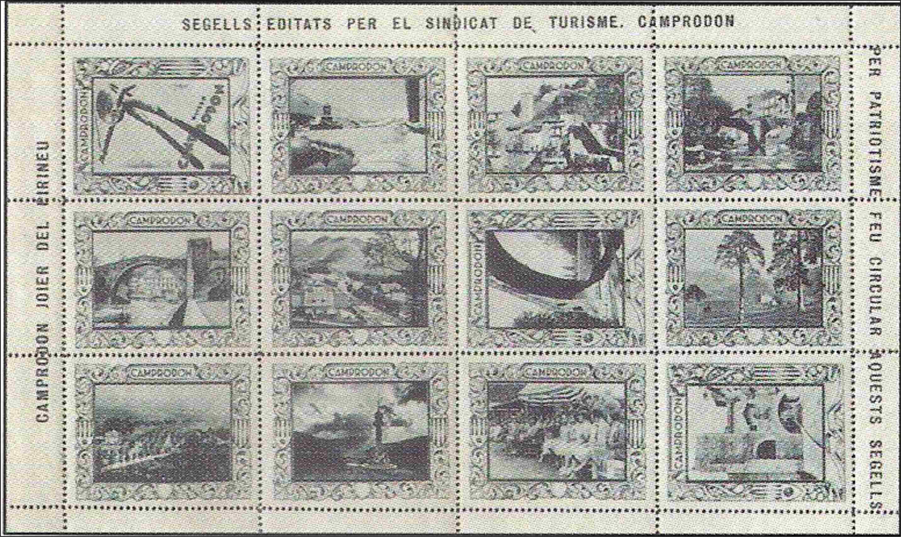 Hace tiempo que intento averiguar algo sobre las siguiente viñetas turisticas de Camprodòn,,, tengo una hojita sin dentar en azul, un poco oxidada y una viñeta sola de otra serie en marrón. La hojita dentada que muestro estuvo en una subasta.-