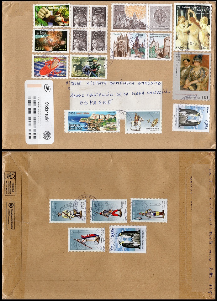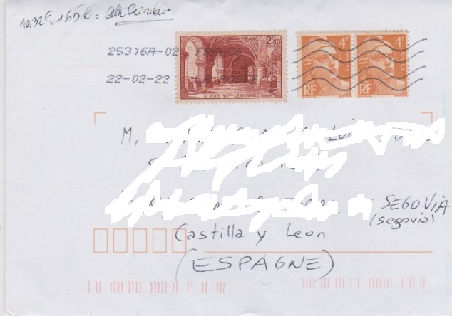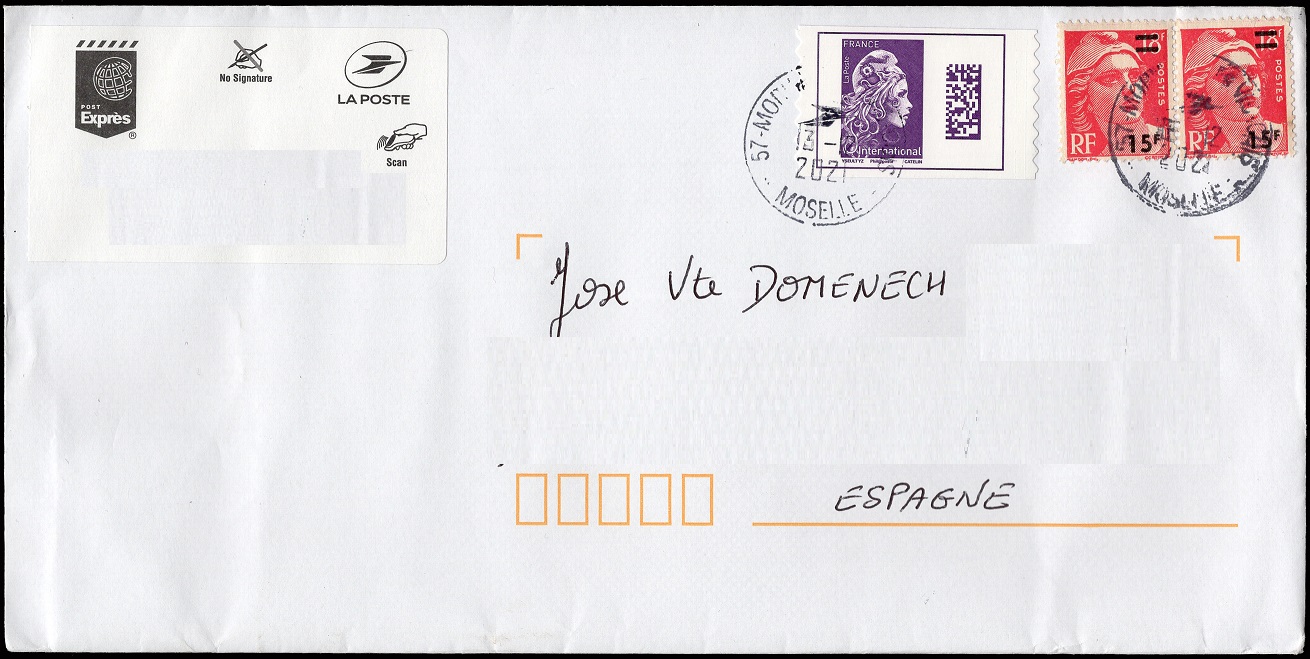 Te ha puesto dos sellos de la Mariana de Gandon de 4 francos, naranja,... emitido en 1948...4 francos antiguos, que fueron cambiados en 1960 por los francos nuevos a razón de 100 francos antiguos por franco nuevo,... o sea que te ha puesto 0,08 céntimos de francos nuevos,... con lo cual se ha ahorrado el 90 % del franqueo,... y encima tiene la desfachatez de poner el cambio en francos nuevos versus euros, en la esquina superior izquierda. Y por supuesto, coló perfectamente en La Poste francesa que, como cualquier otro correo, no está para nada pendiente ni siquiera sabe que es lo que le ponen en los franqueos.