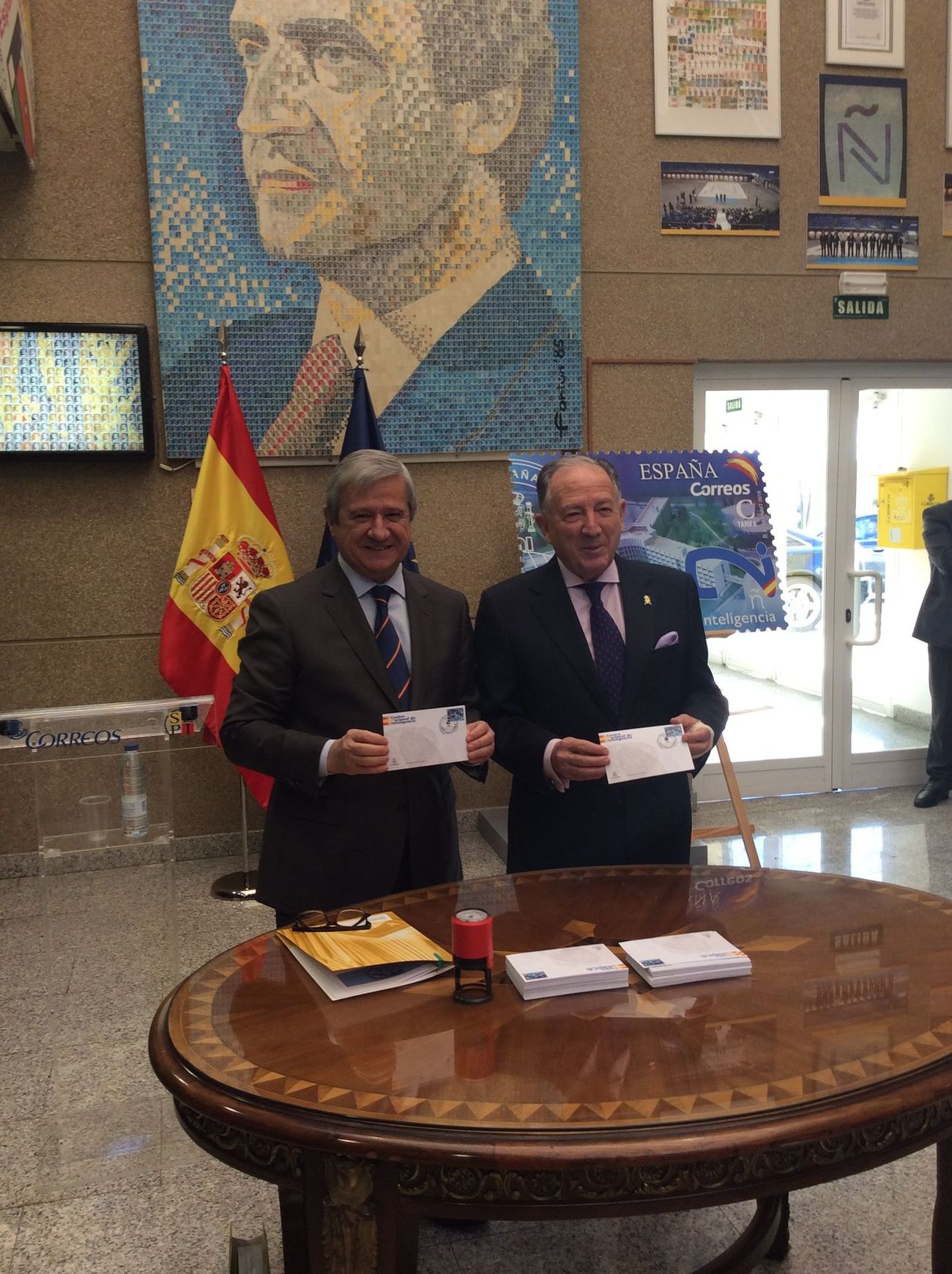 Madrid, 26 de enero de 2018.- CORREOS ha presentado esta mañana, el sello dedicado al Centro Nacional de Inteligencia (CNI), uno de los pilares fundamentales sobre los que se asienta la seguridad del Estado y que, gracias a su capacidad de obtención, análisis y evaluación de la información, permite la anticipación a las Fuerzas y Cuerpos de Seguridad del Estado ante posibles riesgos y amenazas. Al acto han asistido el Secretario de Estado y Director del CNI, Felix Sanz Roldán, y el Presidente de CORREOS, Javier Cuesta Nuin, entre otros.